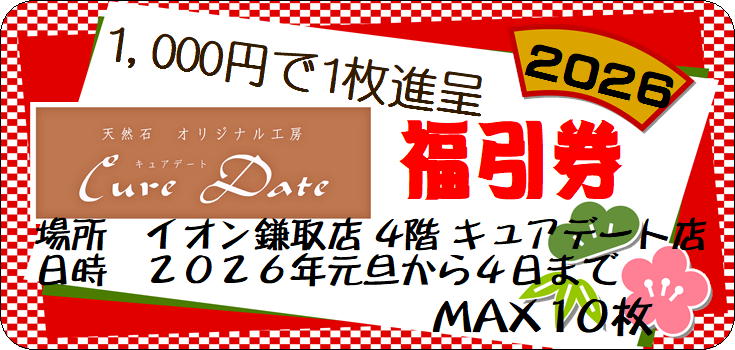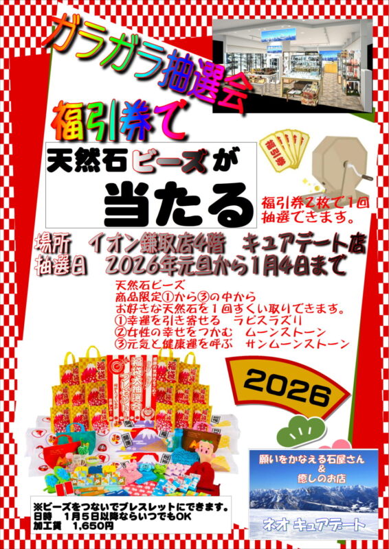 2026年お正月福引券 配布スタート! 2025.12.01 お正月の毎年のお楽しみ♪ ガラガラ抽選会2026年も開催です!! イオン鎌取店にて、元日より4日間。 天然石ビーズが当たる?! 抽選券は本日より両店舗にて配布スタートです! イオン鎌取店・錦糸町マルイ店にて 1000円お買い上げごとに1枚 MAX10枚まで 新年の開運はここから。 抽選で天然石を手に入れましょう!!